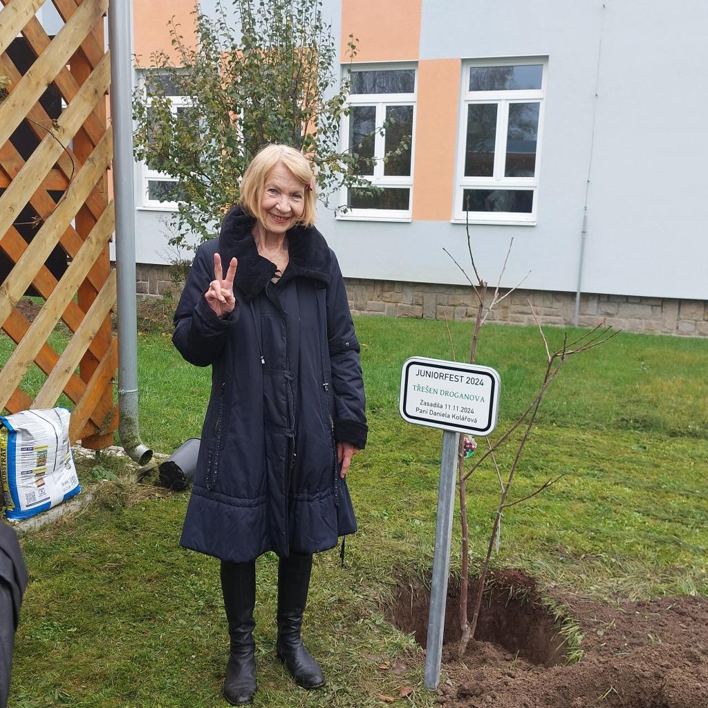 V rámci 17. ročníku mezinárodního filmového festivalu pro děti a malé publikum JUNIORFEST, navštívila naši školu paní Daniela Kolářová. S našimi dětmi a učiteli se setkala v hale ZŠ. Zhlédla krátké vystoupení, které si pro ni děti, pod vedením paní učitelky Dity Kovářové, připravily a pak ochotně odpovídala na jejich dotazy. Na závěr se zájemcům podepsala a zasadila na naší školní zahradě již 2. strom Juniorfestu, třešeň.