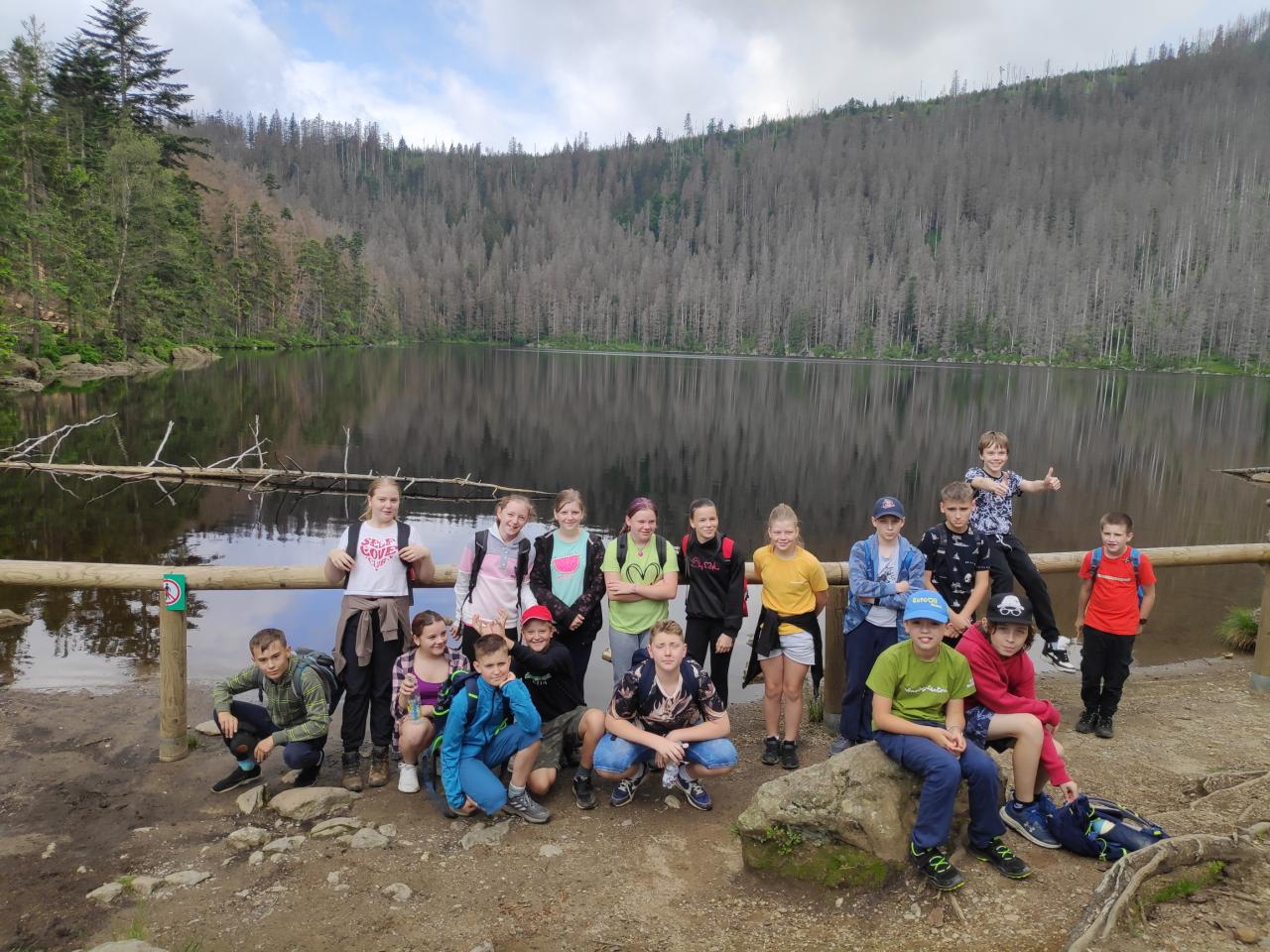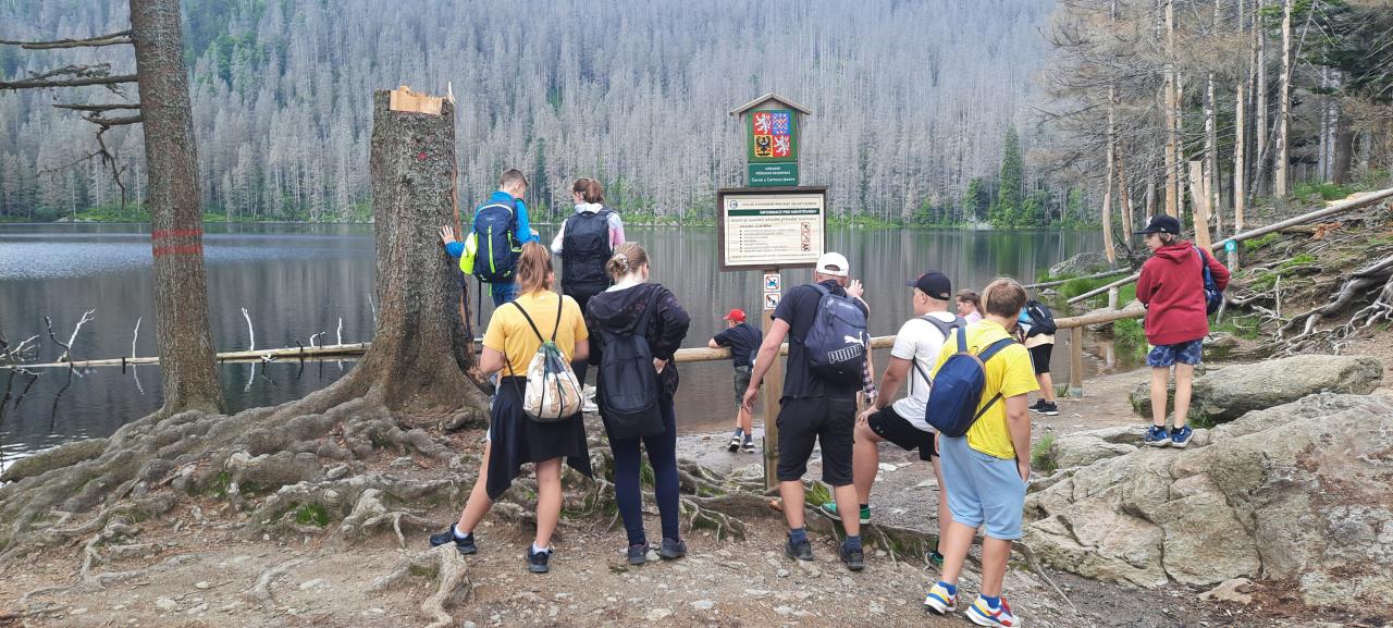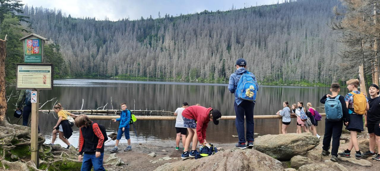 Čertovo jezero, kdysi obklopené hustými lesy, nám připomnělo, proč je Šumava tak magické místo. Při pohledu na klidnou hladinu jezera jsme si uvědomili, jak je důležité chránit tyto přírodní poklady. Zde jsme si odpočinuli, abychom nabrali síly na pokračovaní v našem putování. Čekala nás nejnáročnější část naší cesty - sestup k Černému jezeru. Cesta byla strmá a vyžadovala naši plnou pozornost, ale vzájemná podpora, komunikace a povzbuzování nám pomohlo překonat i ty nejtěžší úseky. Po sestupu jsme dorazili k Černému jezeru. Je to největší přírodní ledovcové jezero České republiky. Jeho temná hladina, která dala jezeru jméno, je způsobena devítimetrovou vrstvou kalu na dně jezera. Po odpočinku u Černého jezera jsme se vydali zpět na Špičácké sedlo. Cesta zpět byla příjemná, zavzpomínali jsme na ,,Zdenu pod kořenem“ a vyprávěli si různé příběhy, které nám zkrátily cestu a osvěžily naši dobrou náladu.